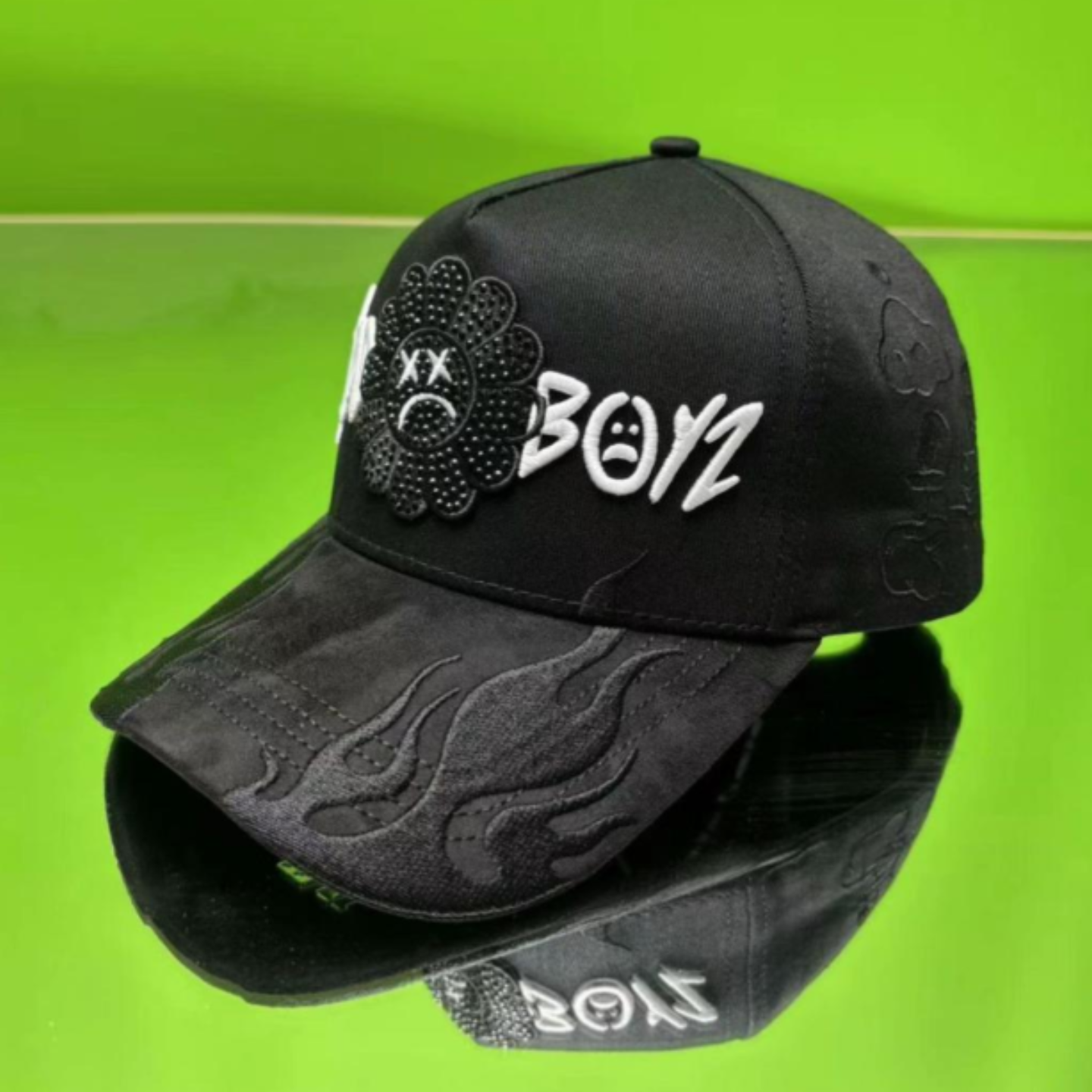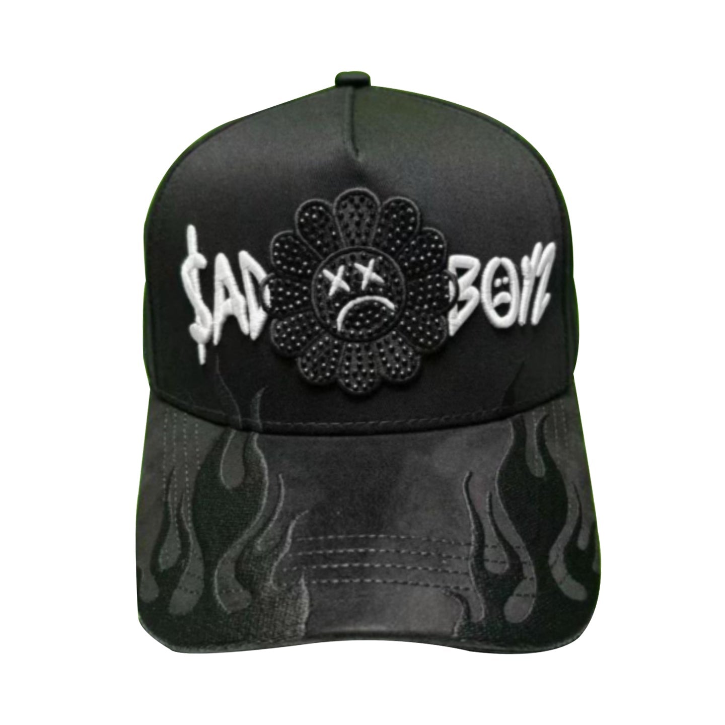 Elevate your streetwear game with this sleek **black baseball cap**, featuring bold "Sad Boyz" in striking 3D white embroidery on the front. The design is accented with a black sad sunflower, delicately embellished with black crushed diamonds for a touch of edgy luxury. The cap’s curved brim is detailed with flame-shaped embroidery, adding a fiery, rebellious vibe to your look.